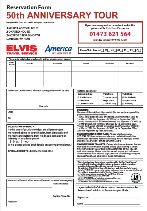 If you have any queries regarding the holiday detailed in this brochure please don’t hesitate to phone the Elvis Travel Service on 01473 621 564 or America as you like it on 020 8742 8299.